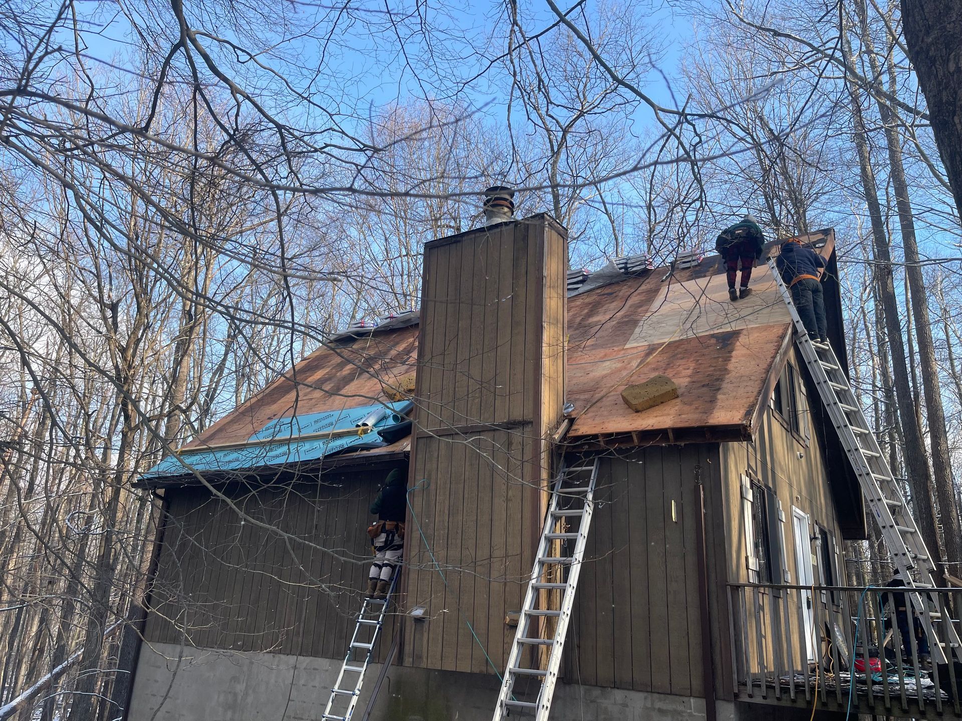 A group of people are working on a roof in the woods.