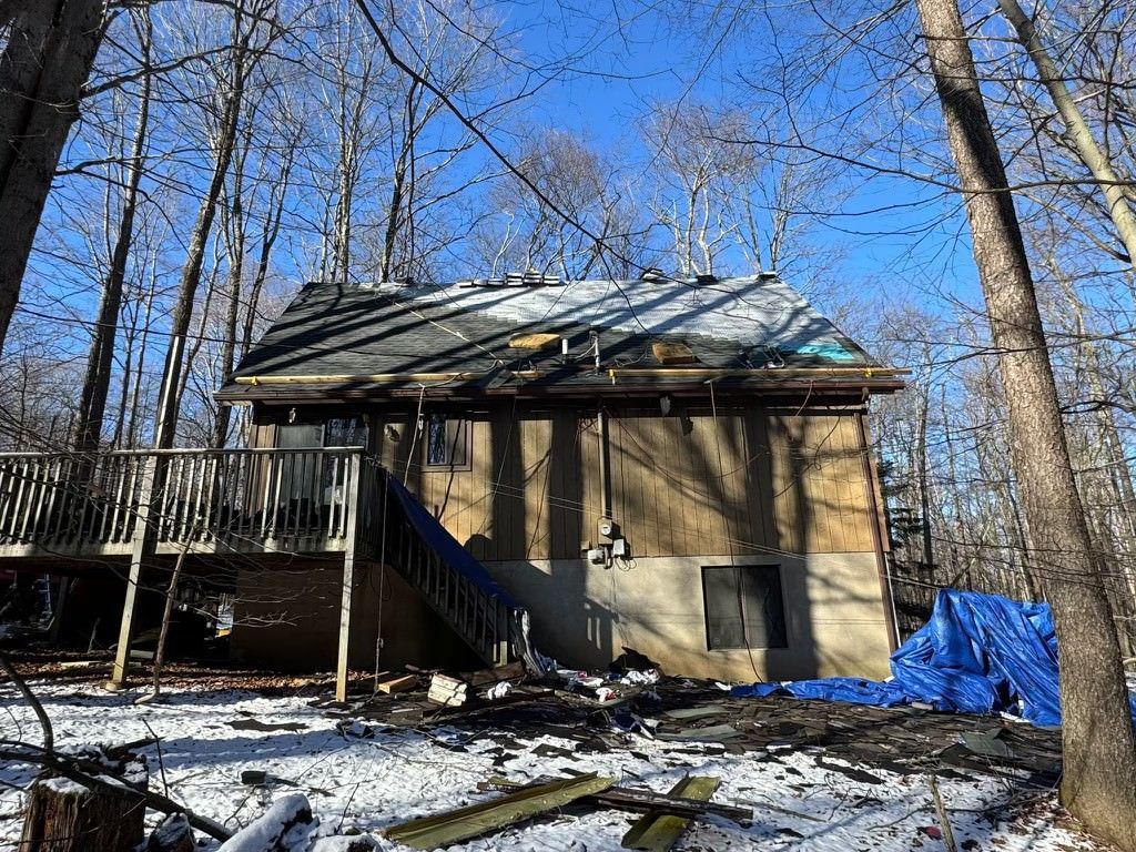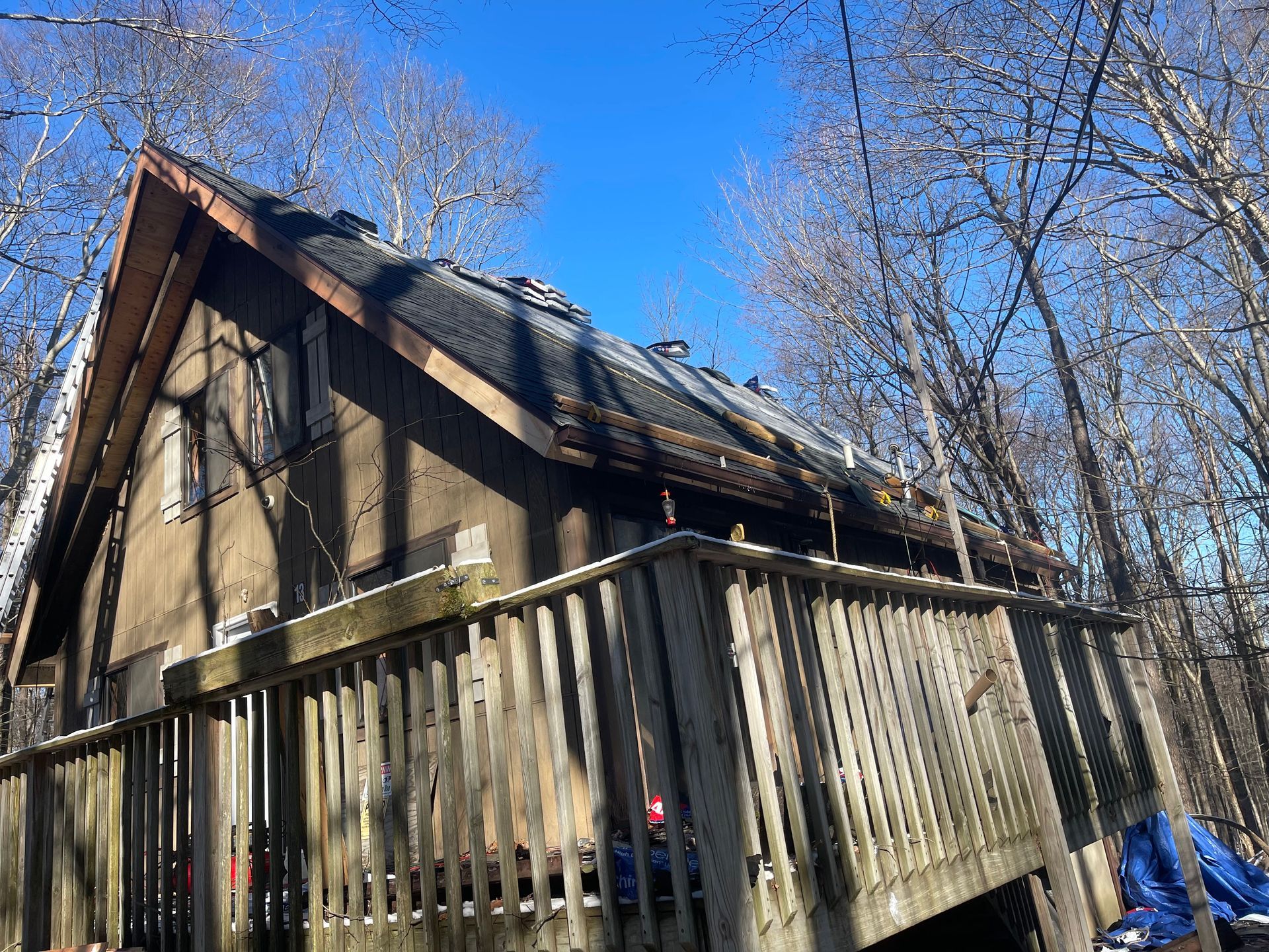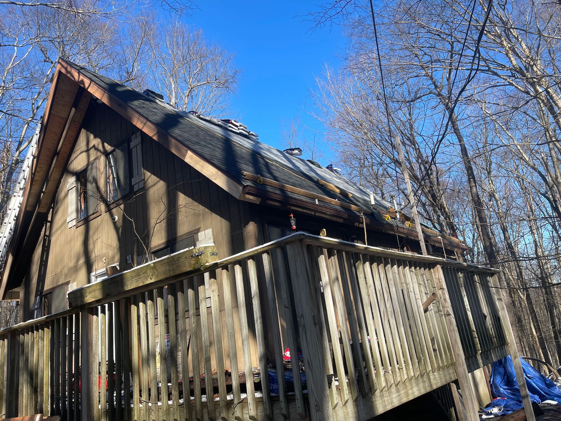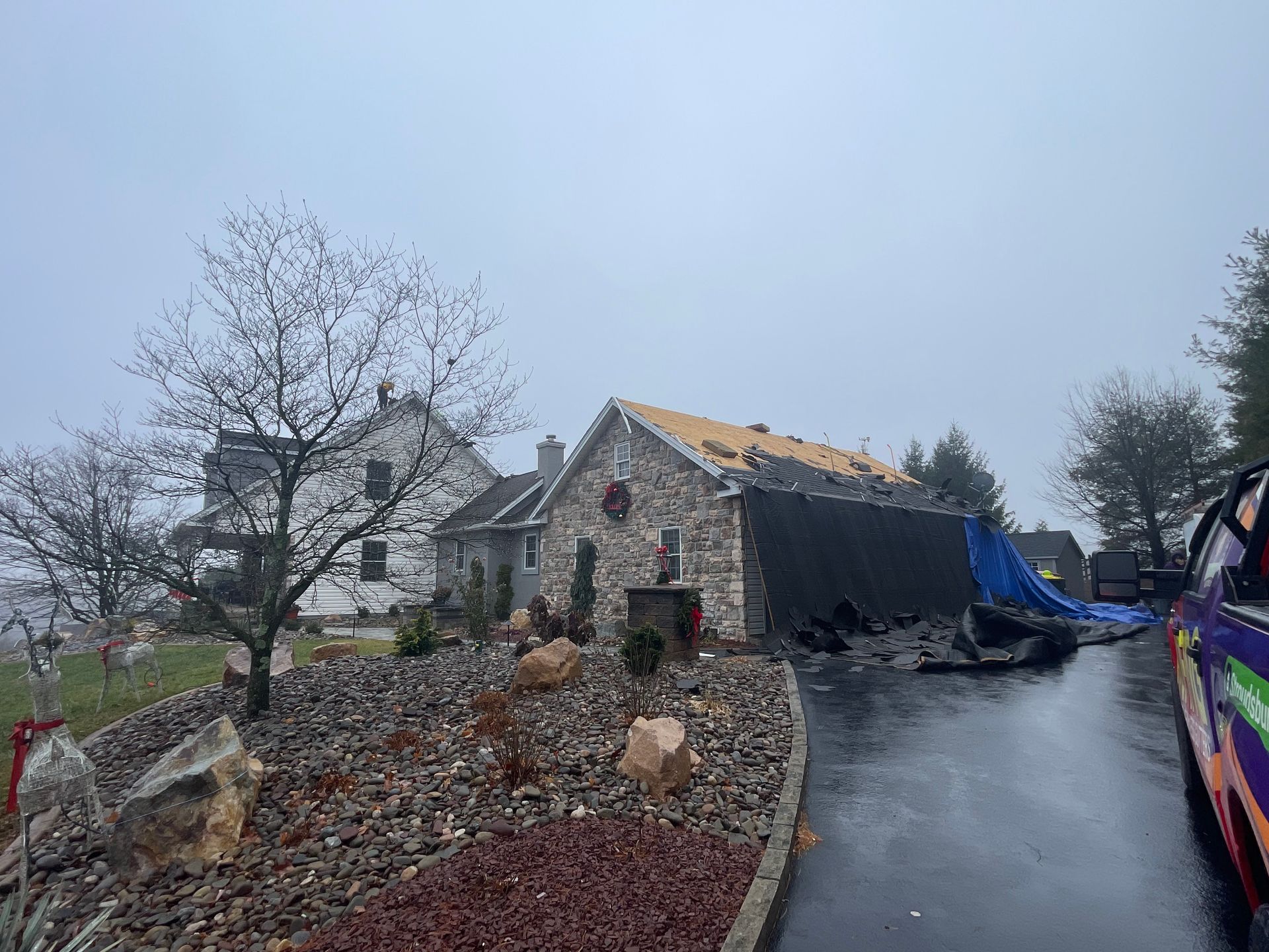 A roof is being repaired with a blue tarp covering it.