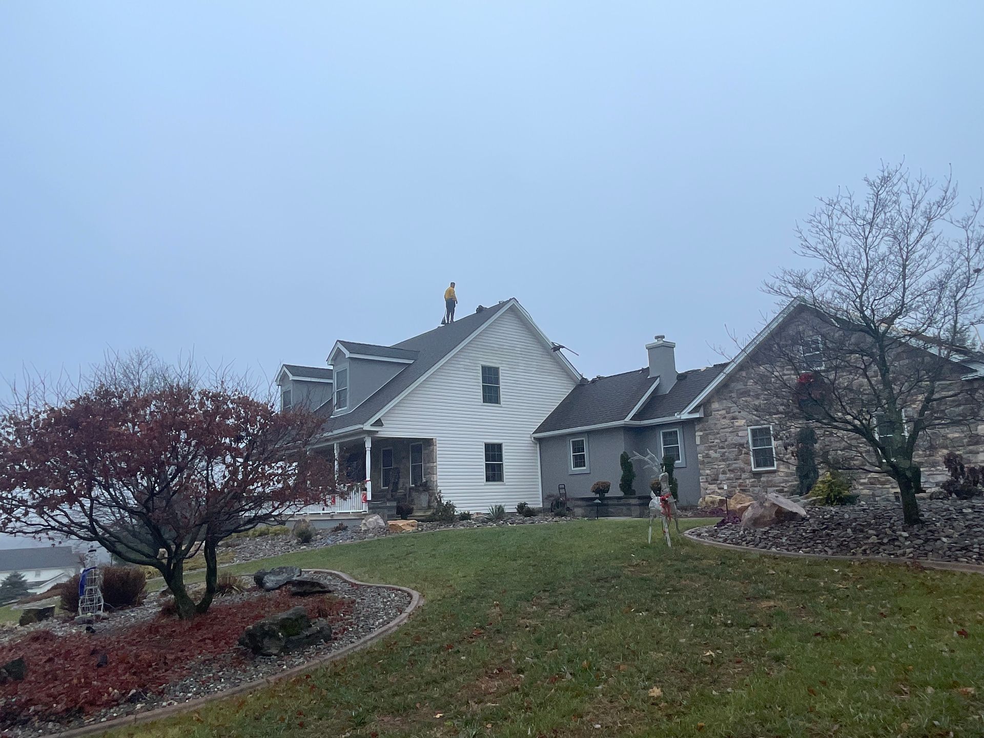 A man is working on the roof of a house.