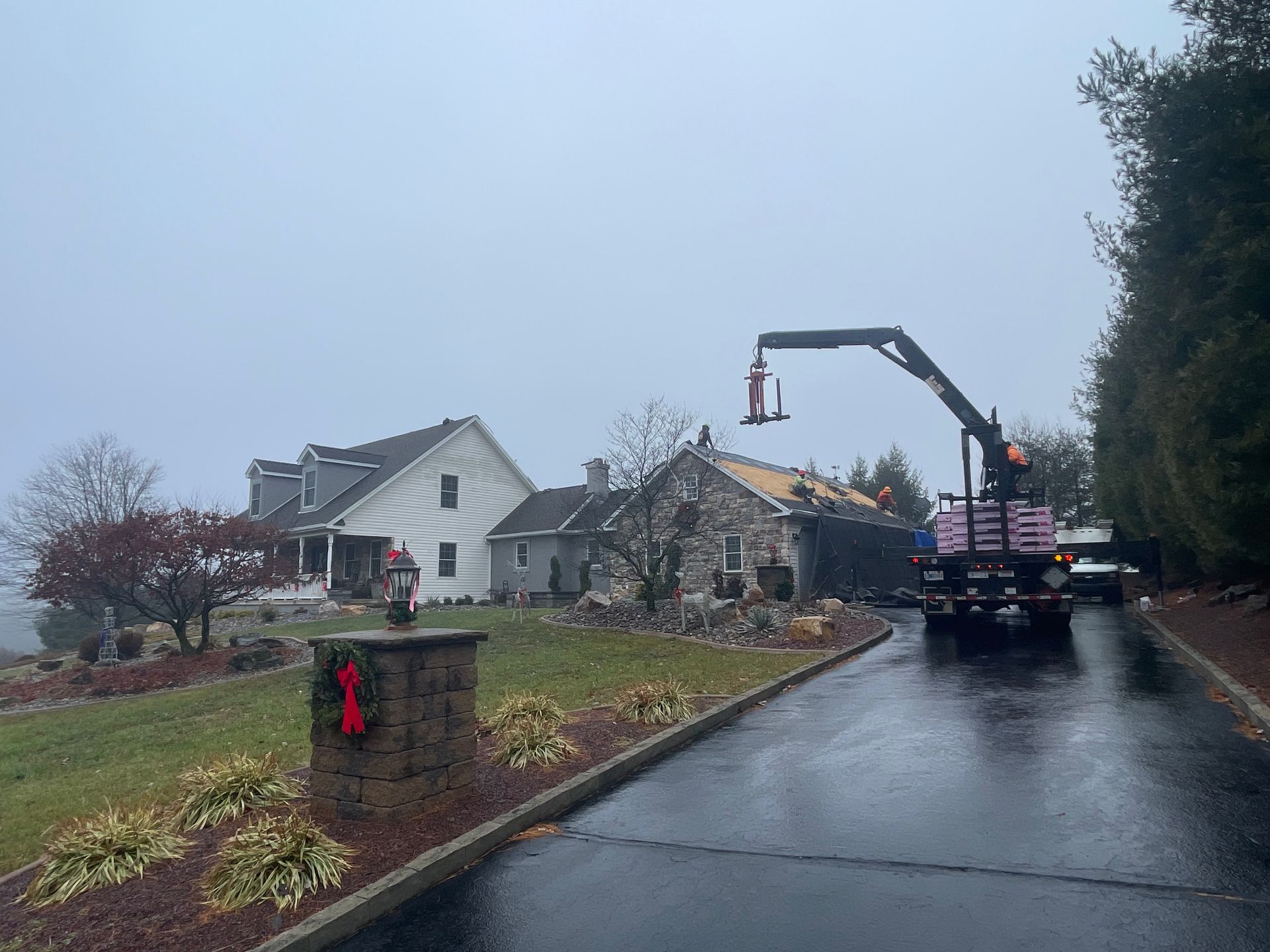 A roofing truck is parked in front of a garage.