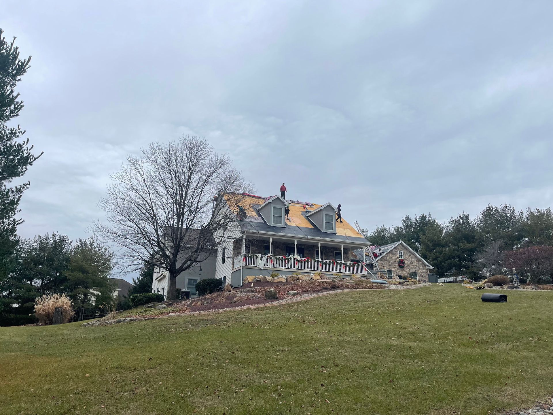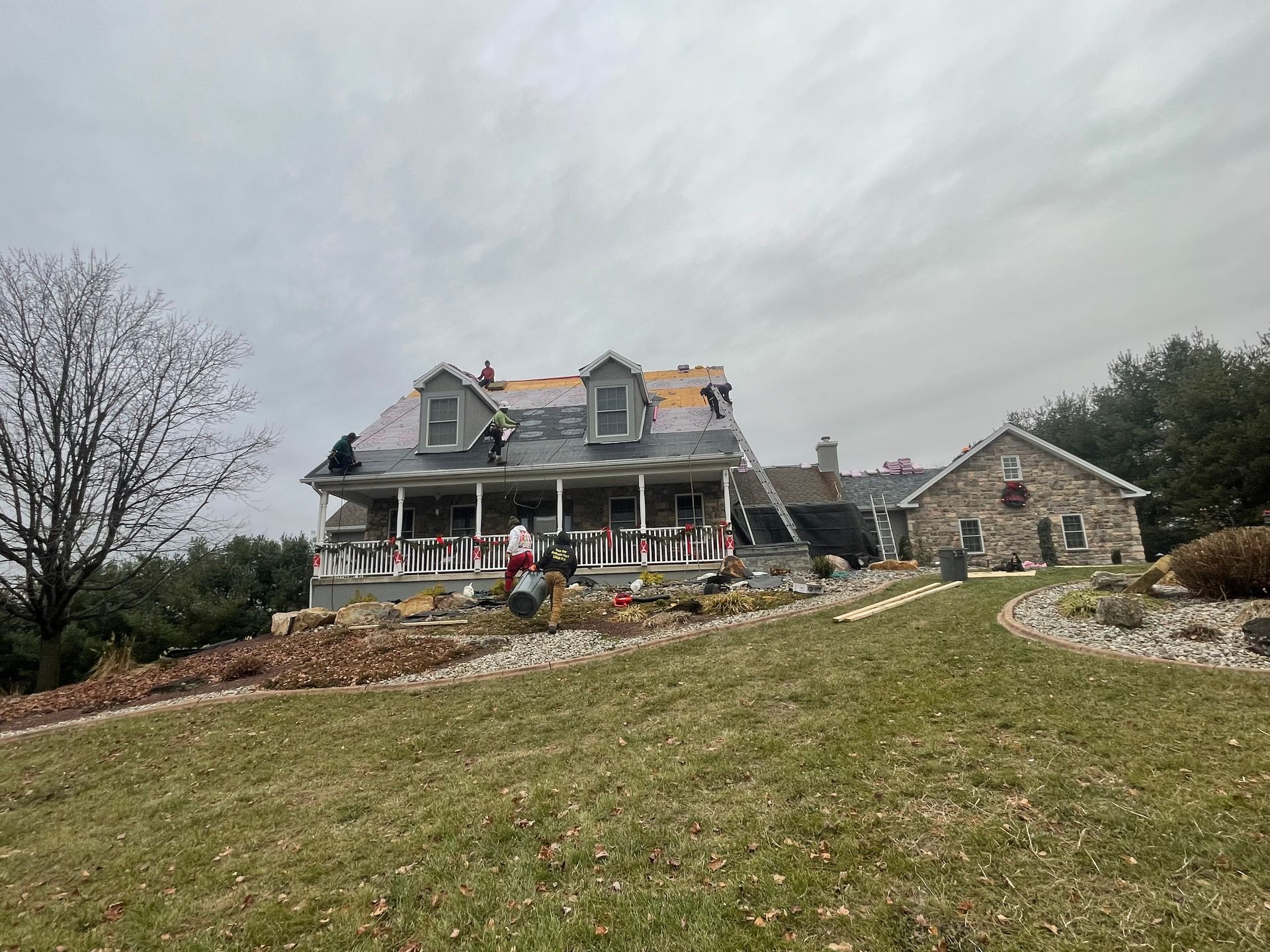 A group of people are working on the roof of a house.